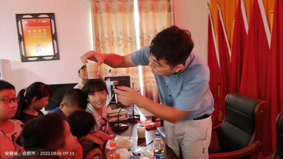 今年暑假,為解決假期中小學(xué)生“看護(hù)難”問題,惠峰村駐村工作隊和村“兩委”依托新時代文明實踐站組織開設(shè)了首期“五彩假日”暑期托管班。通過招募愛心志愿者,在假期義務(wù)為本村孩子提供公益看護(hù)、課業(yè)輔導(dǎo)、興趣培養(yǎng)、文化教育、課外實踐等服務(wù)。安徽中青檢驗檢測有限公司黨支部、企業(yè)科協(xié)應(yīng)邀派遣工作人員,為孩子們用課程和實驗相結(jié)合的方式,開展了一場趣味食品安全教學(xué)。